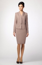 Классический костюм, состоящий из жакета и юбки. Жакет полуприлегающий с декоративными вставками и воротником шаль. Юбка классической длины на обтачке.
