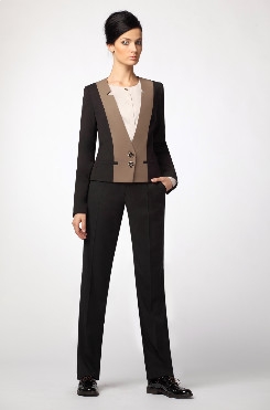 Офисный костюм тройка. Жакет полуприлегающего силуэта с фигурным краемборта, застегивающийся на две пуговицы. Центральная часть переда и центральная часть спинки контрастного бежевого цвета. Брюки прямые классические с боковыми карманами и заутюженными стрелками.