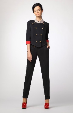Молодежный костюм тройка, состоящий из жакета, блузки и брюк. Жакет укороченный с отделкой из красной ткани и пуговицами, двух бортной застежкой и асимметричным низом. Блузка из шелковой ткани с коротким рукавом. Брюки по низу на манжете и с накладными деталями по поясу.