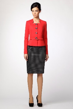 Костюм женский полуприлегающего силуэта. Жакет с фигурными рельефами, отрезной баской, с ассиметричным низом и поясом по талии. Юбка на обтачке из ткани в клетку.