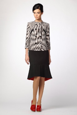 Костюм, состоящий из жакета и юбки. Жакет полуприлегающего силуэта из ткани "гусиная лапка" с двухбортной застежкой. Юбка с воланом по низу из однотонной костюмной ткани с контрастной подкладкой.