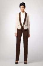 Деловой костюм тройка, состоящий из жакета, блузки и брюк. Жакет полуприлегающего силуэта с застежкой на крючок. Блузка из шелковой ткани с фигурными рельефами. Брюки классические на поясе, со стрелками.