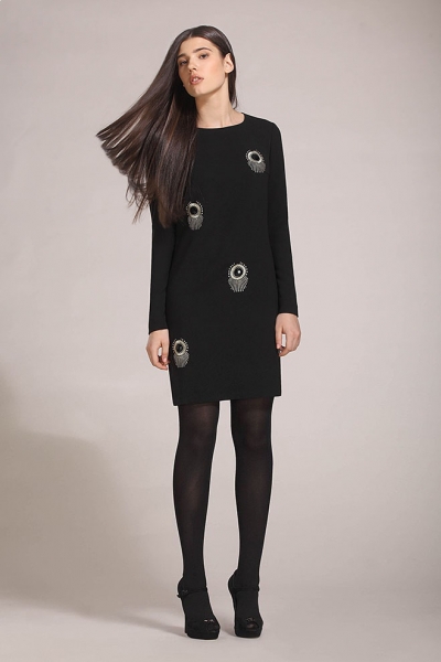 Полуприлегающее платье выше колен. Круглая горловина. Длинный рукав. Декор: вышивка, камни. Трикотажная подкладка